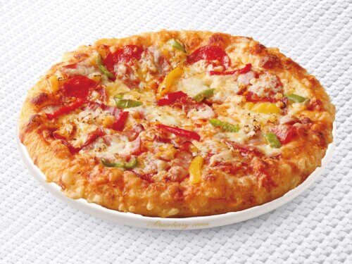 プリッと食感の粗挽きソーセージに、ジューシーなベーコンやペパロニをトッピング。ボリューム満点ピザ!